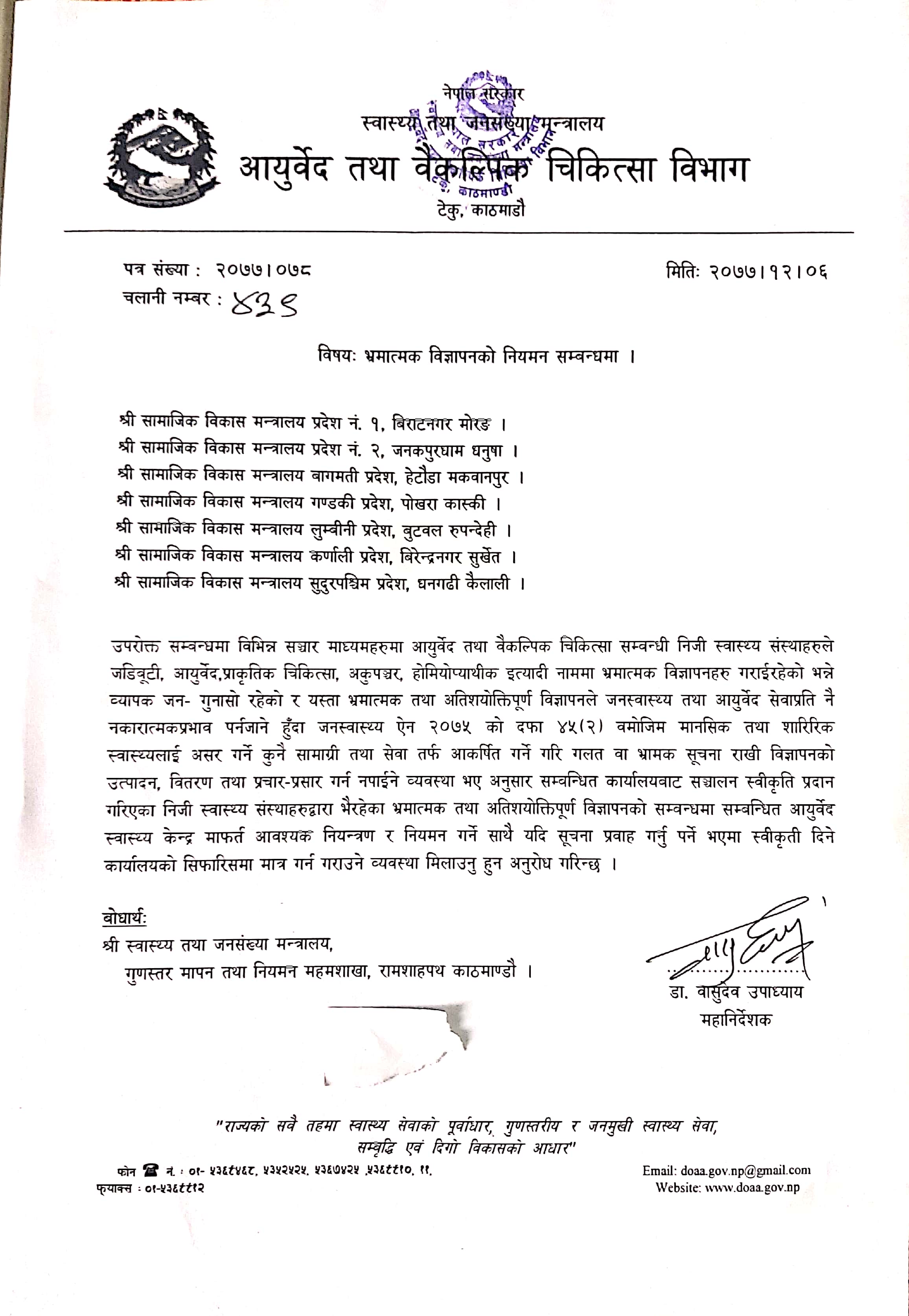 क्षारसूत्र सेवा प्रदान गर्ने आयर्वेद संस्थाहरुको नियमन मार्गदर्शन सम्बन्धि परिपत्र